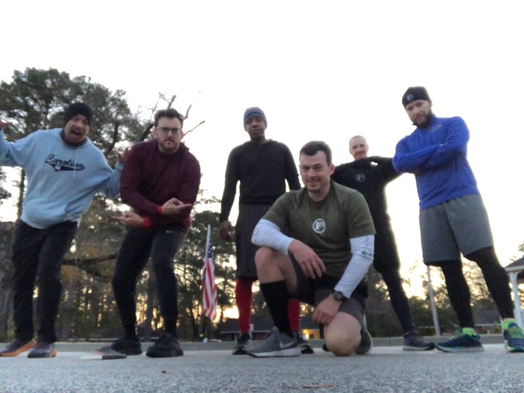 BLOCK BRIGADE: 8 KB Block Swings, 8 Kingmakers/cinderblock cleans (pushup, deadlift, curl, press), Farmer Carry to lightpole and back, 8 KB Swings, 8 Kingmakers