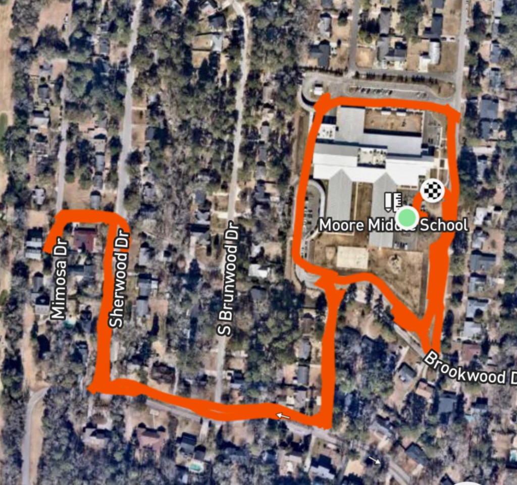 Mosey to Parking Lot Stop Sign on Cheraw Drive; Indian Run to Chreaw/ Brockwood Stop Sign.