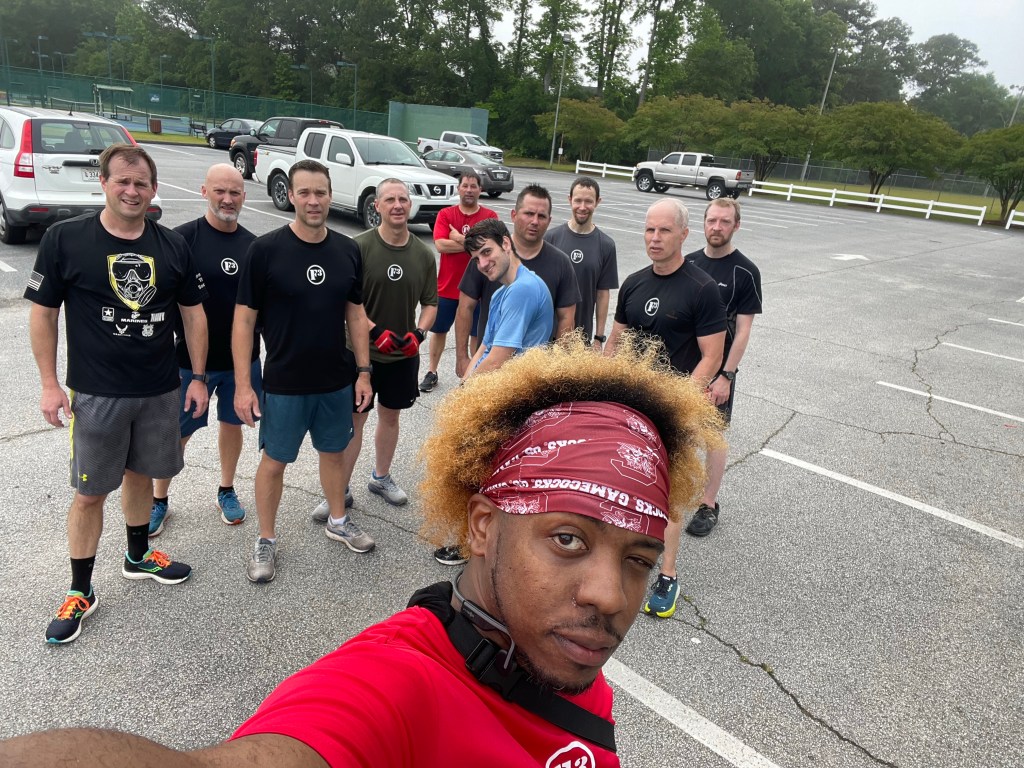 - Round 4 – Partner A – Squats while Partner B mosey to the end of the parking lot and perform 15 merkins