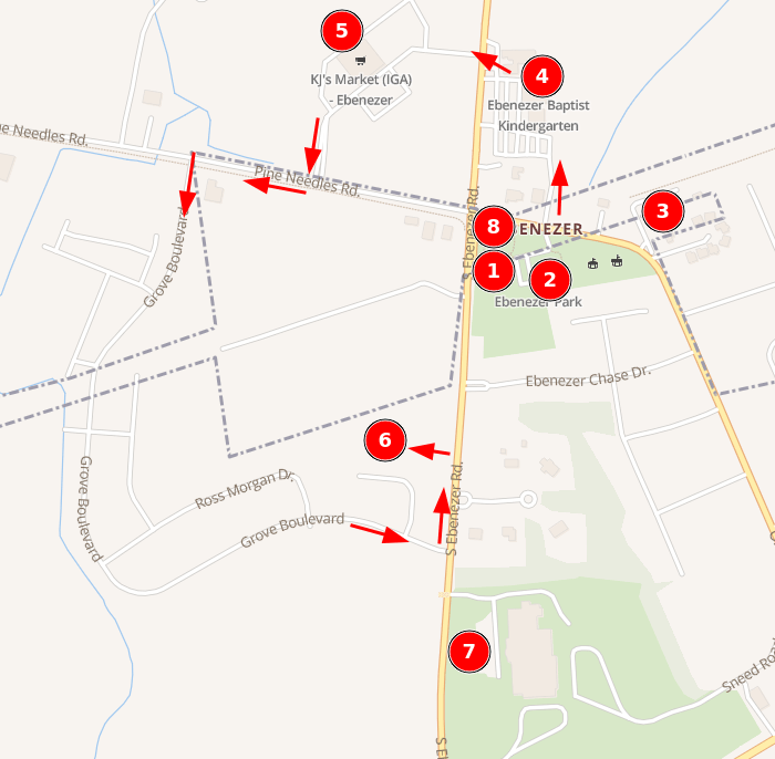 Mosey out of the KJ’s parking lot towards Pine Needles road, head towards the bridge. Go through the Grove neighborhood.